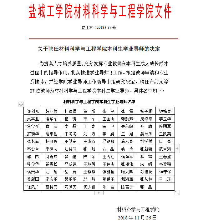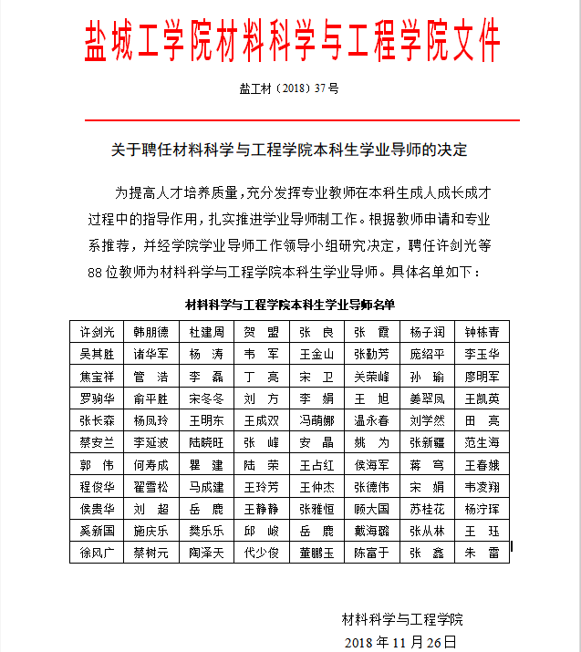 关于聘任材料科学与工程澳门人威尼斯3966本科生学业导师的决定-澳门人威尼斯3966