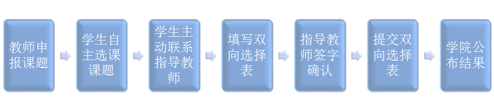 | 学生填写双向选择表,指导老师签字后递交专业系,各专业系汇总后电子版发送至clxyjwk@ycit.cn
